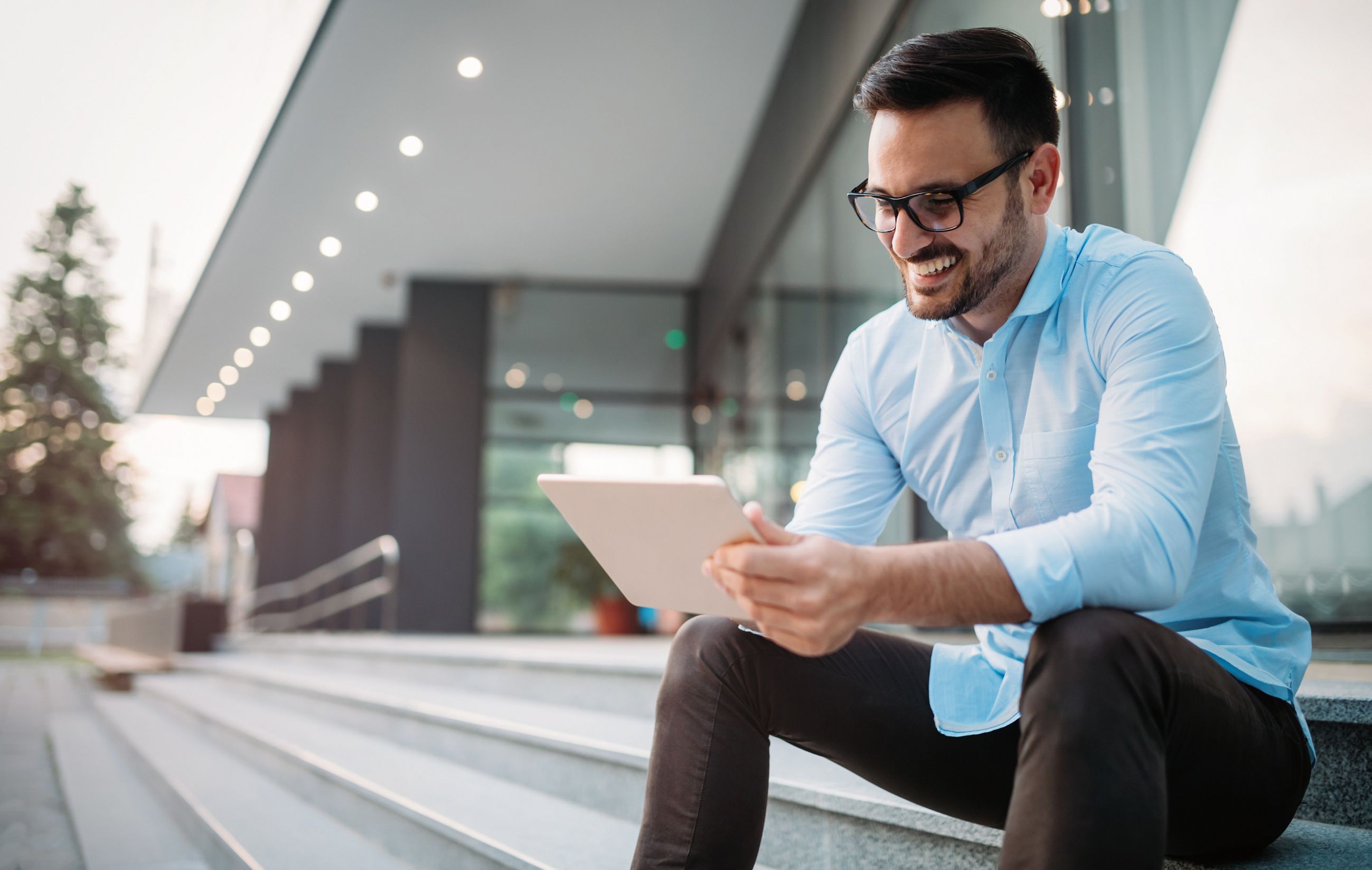 Portrait of businessman sitting on steps outside an office building holding digital tablet
